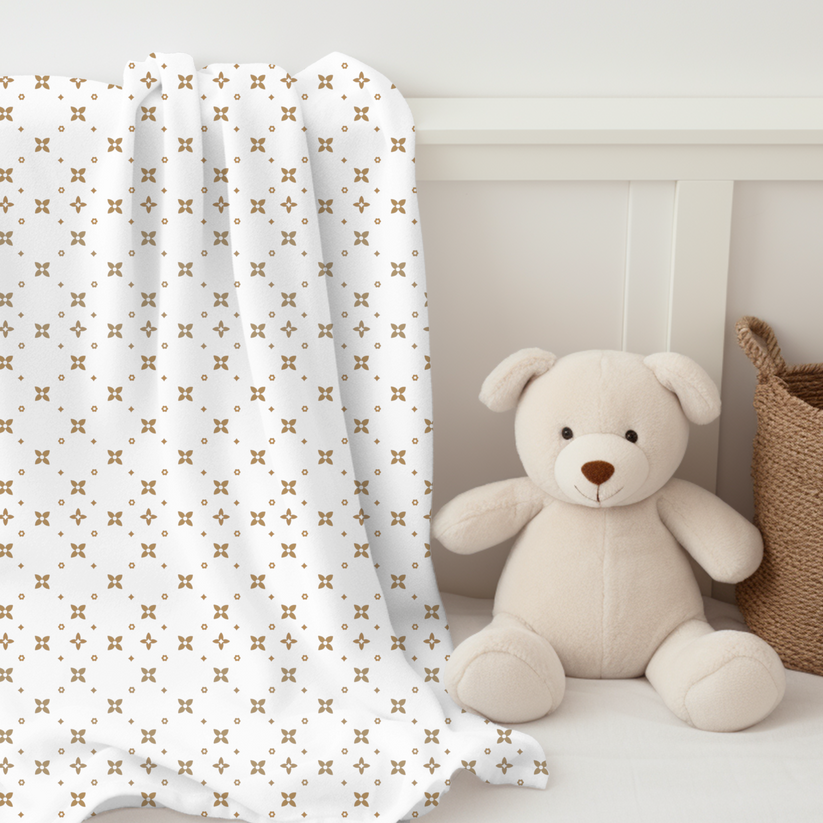 Aus 100 % weichem Polyestersamt gefertigt, ist es sanft zur empfindlichen Haut und bietet gleichzeitig leichte Wärme. Perfekt zum Wickeln, für Kinderwagenfahrten oder als Akzent im Kinderzimmer – der doppelseitige Druck sorgt für Eleganz aus jedem Blickwinkel. Fügen Sie einen Namen oder ein Monogramm hinzu, um ein Erinnerungsgeschenk zu gestalten, das Eltern schätzen werden.