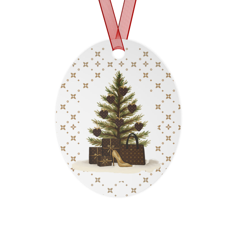 Verleihen Sie Ihrem Weihnachtsbaum einen schicken Weihnachtslook mit unserem exklusiven ovalen Metallornament. Es zeigt einen festlichen Weihnachtsbaum, geschmückt mit Sabletten-Herzornamenten, passenden Geschenken und einem funkelnden Goldabsatz. Dieses Andenken ist auf strapazierfähigem, weiß beschichtetem Metall mit glänzender Oberfläche gedruckt und hält viele Jahre lang.