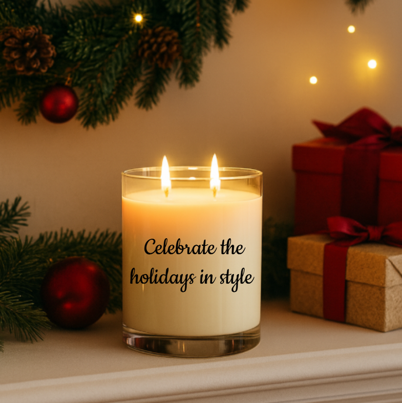 Donde la moda se fusiona con la fragancia. Nuestra vela navideña "Tacones y Bolso Dorados" transforma la alta costura en un ambiente acogedor con una glamurosa ilustración envuelta alrededor de una vela de cera de soja de doble mecha, lista para personalizar por detrás y crear un regalo único.