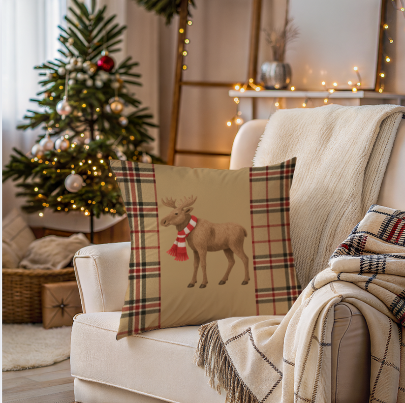 Bring a warm winter moment into your home with this cozy Moose & Tartan Pillow Case — a wonderful blend of rustic lodge style and polished, alpine chic design. Featuring your custom illustrated moose in a classic red-and-cream scarf, framed by a timeless, neutral tartan that complements any seasonal décor. Perfect for the holidays or for anyone who loves a refined cozy cabin aesthetic.